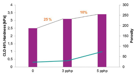 與市場(chǎng)上的其他硬化添加劑不同,NT H18可顯著提高硬度,同時(shí)不影響泡沫的孔結(jié)構(gòu)。當(dāng)NT H18添加到配方中時(shí),沒有必要改變TDI或錫的量來維持開孔結(jié)構(gòu)。使用量為1至5pphp,取決于所需的硬度增加。取決于泡沫密度,配方和生產(chǎn)參數(shù),可以在不顯著改變孔結(jié)構(gòu)的情況下提高35%的硬度。