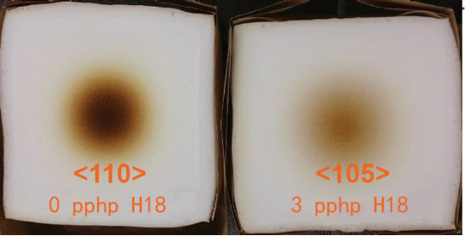 NT H18不僅可用于增加硬度,還可用于減少配方中TDI,聚合多元醇或錫的含量,同時保持海綿硬度。因此,如果需要,它可用于降低成本,并促進工藝條件(反應溫度)。如表2所示,在參考配方實驗室條件下,密度為21kg/m3海綿中添加3pphp的NT H18,將TDI指數從105降低到100,硬度保持幾乎恒定,并且可顯著改善海綿黃化問題,如圖二所示。