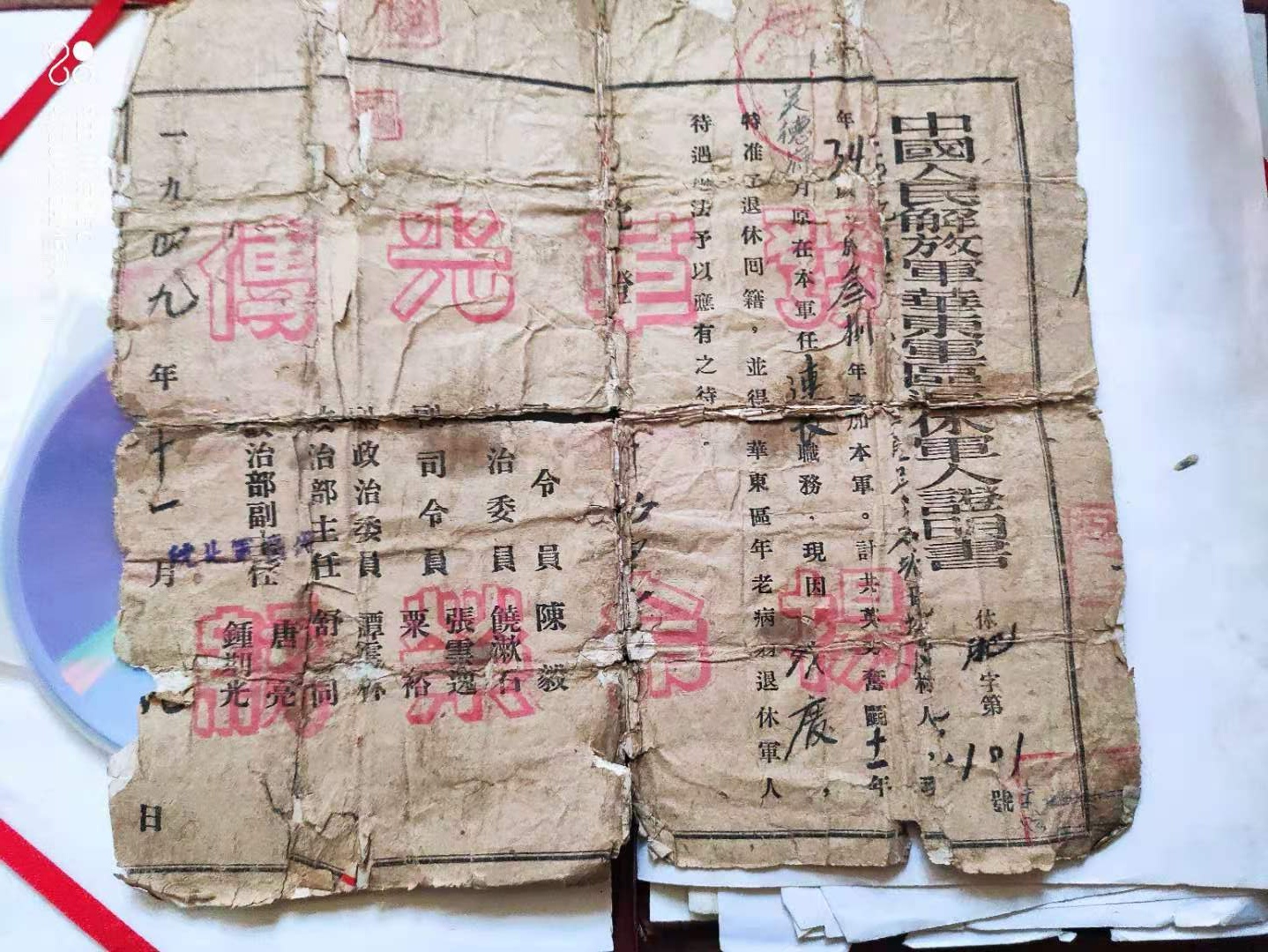 爸爸是1938年2月参加新四军的,为了中华民族的独立和中国人民的解放,跟随陈毅等老一辈无产阶级革命家,不怕流血牺牲,英勇奋战12年,直至新中国成立,才于1949年11月从华东军区7纵19师57团1营上蔚军衔,带着满身疮痍因战残回籍。